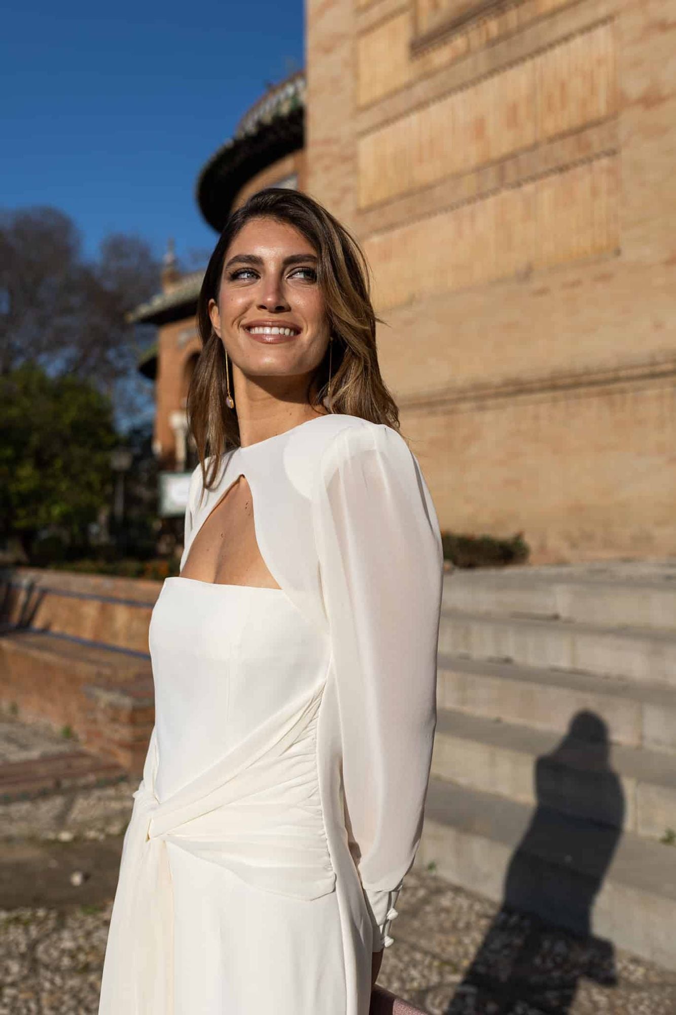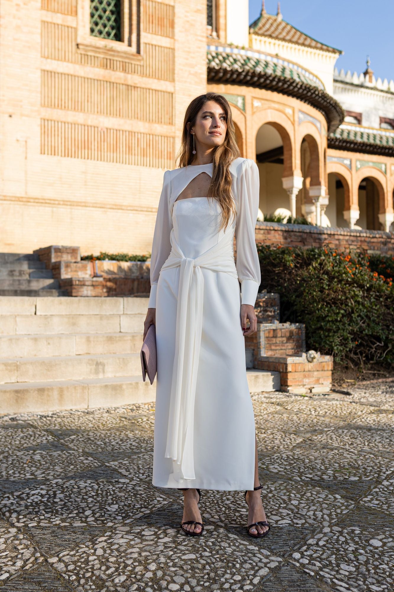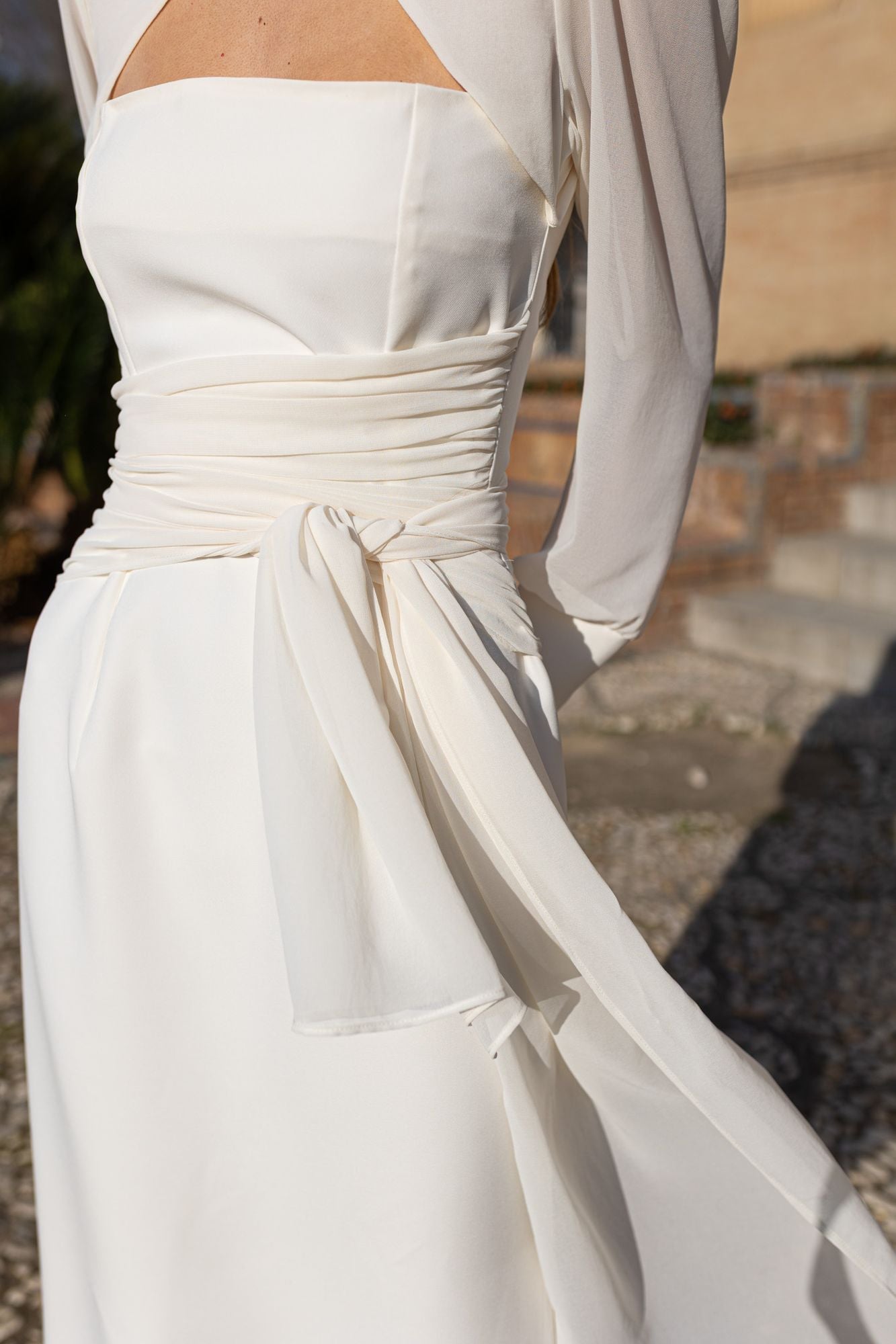 El vestido Sofía es de lo más versátil. Confeccionado en crepé palabra de honor con abertura trasera, incorpora detalles de gasa en las mangas, el cuello y el fajín. Presenta un escote en forma de V invertida que deja entrever el pecho, mangas abullonadas con puño y un fajín multiposición que realza la silueta.